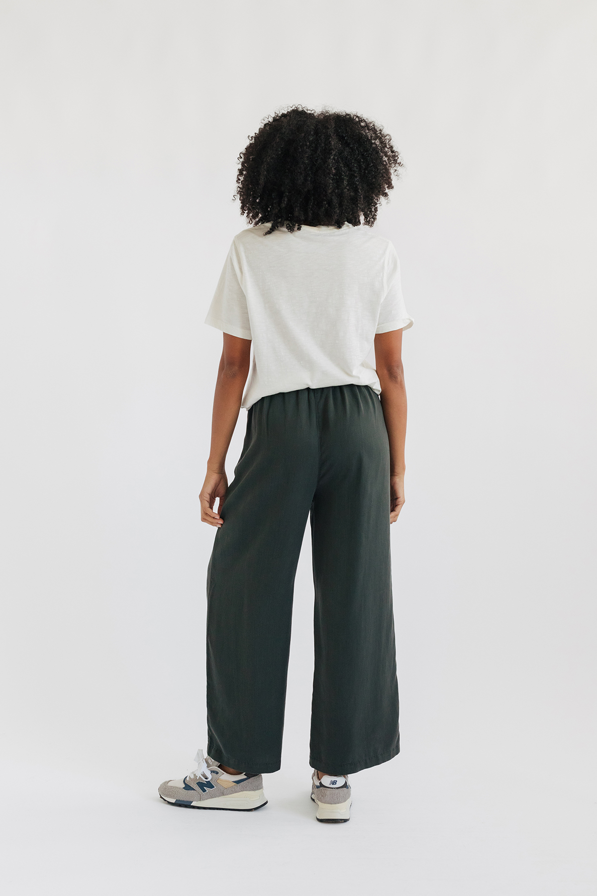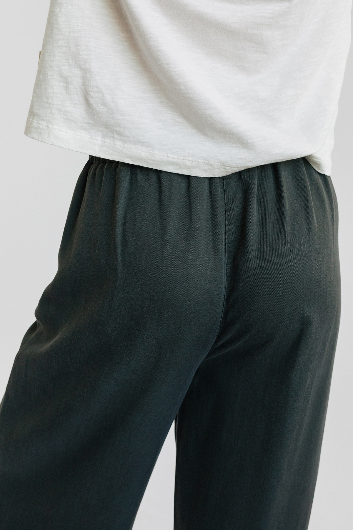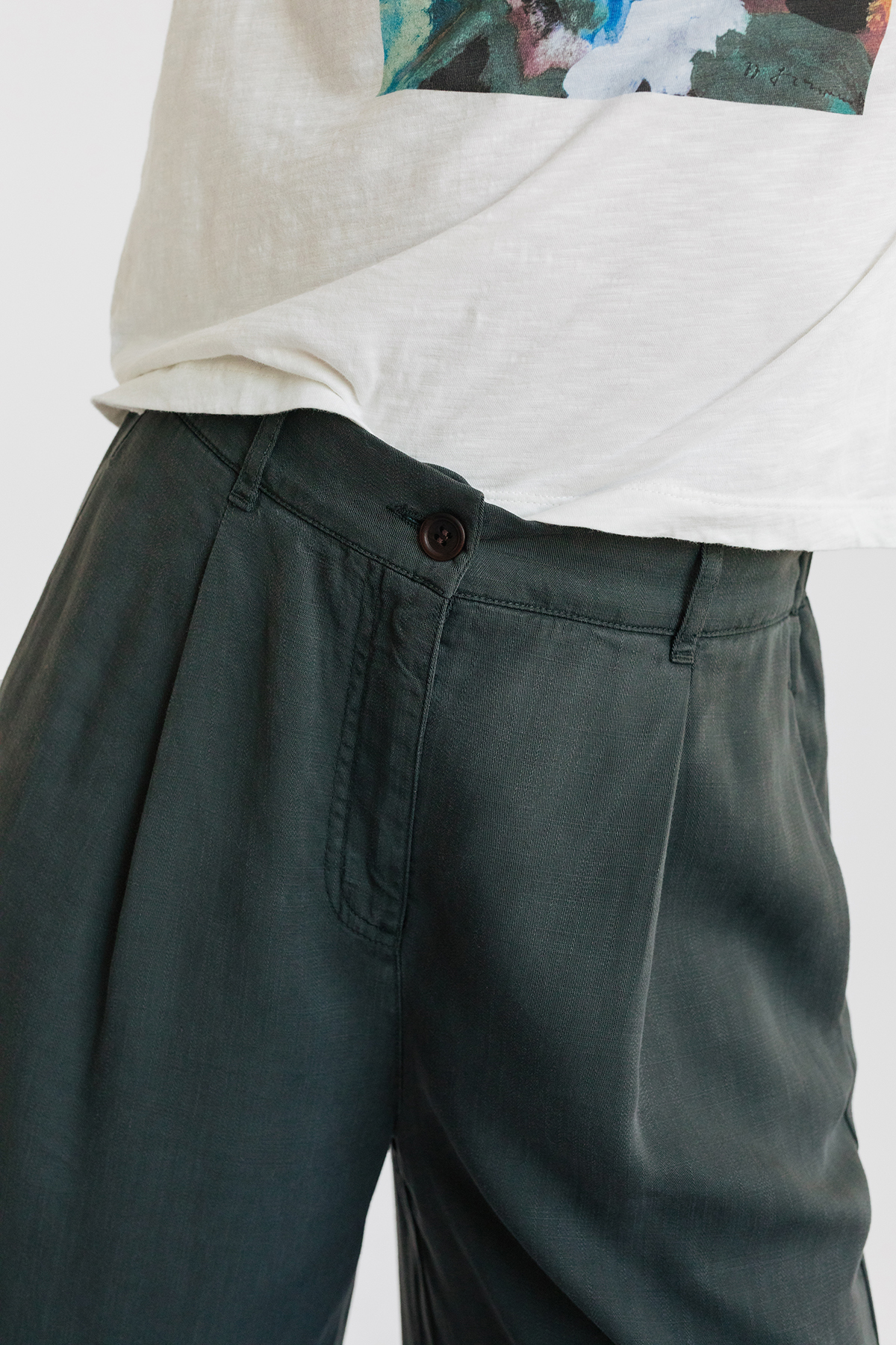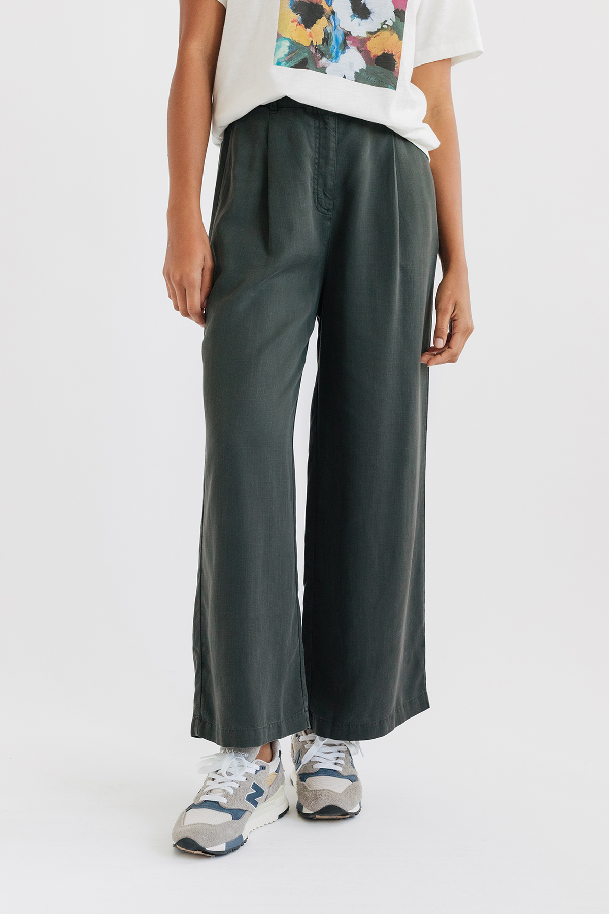 Ankellånga vida byxor i 100% tencel. Byxorna har en mörk sandfärg med gylf och knappar fram i midjan. Tillverkat och designat i EU.